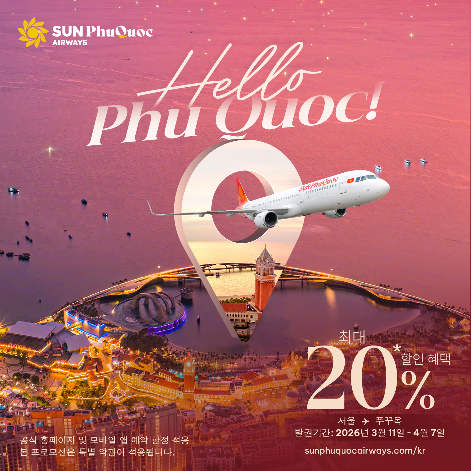 썬푸꾸옥항공은 오는 4월 17일 인천-푸꾸옥 노선 첫 운항을 시작할 예정이며, 이에 맞춰 공식 홈페이지를 통해 항공권 최대 20% 할인 프로모션을 실시한다고 밝혔다.
