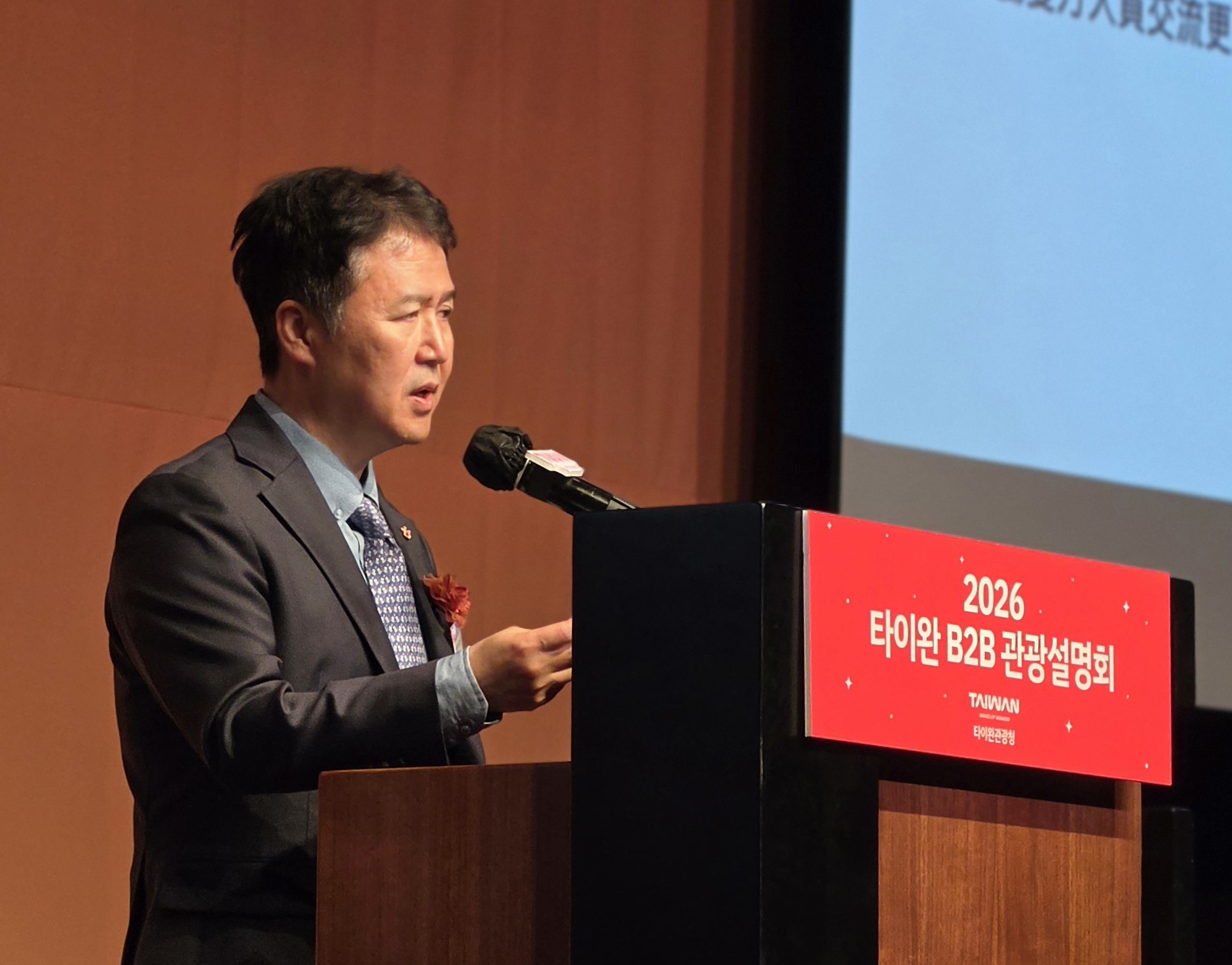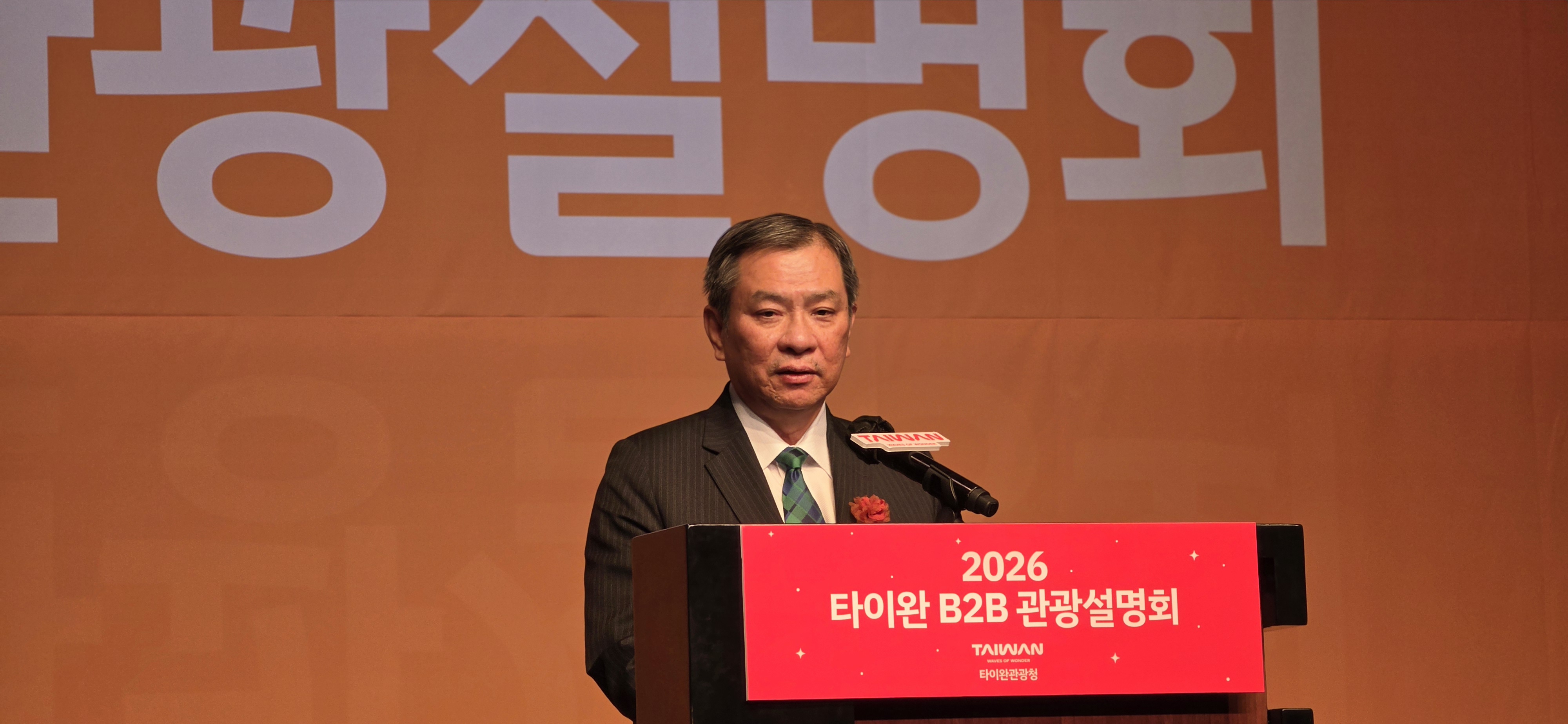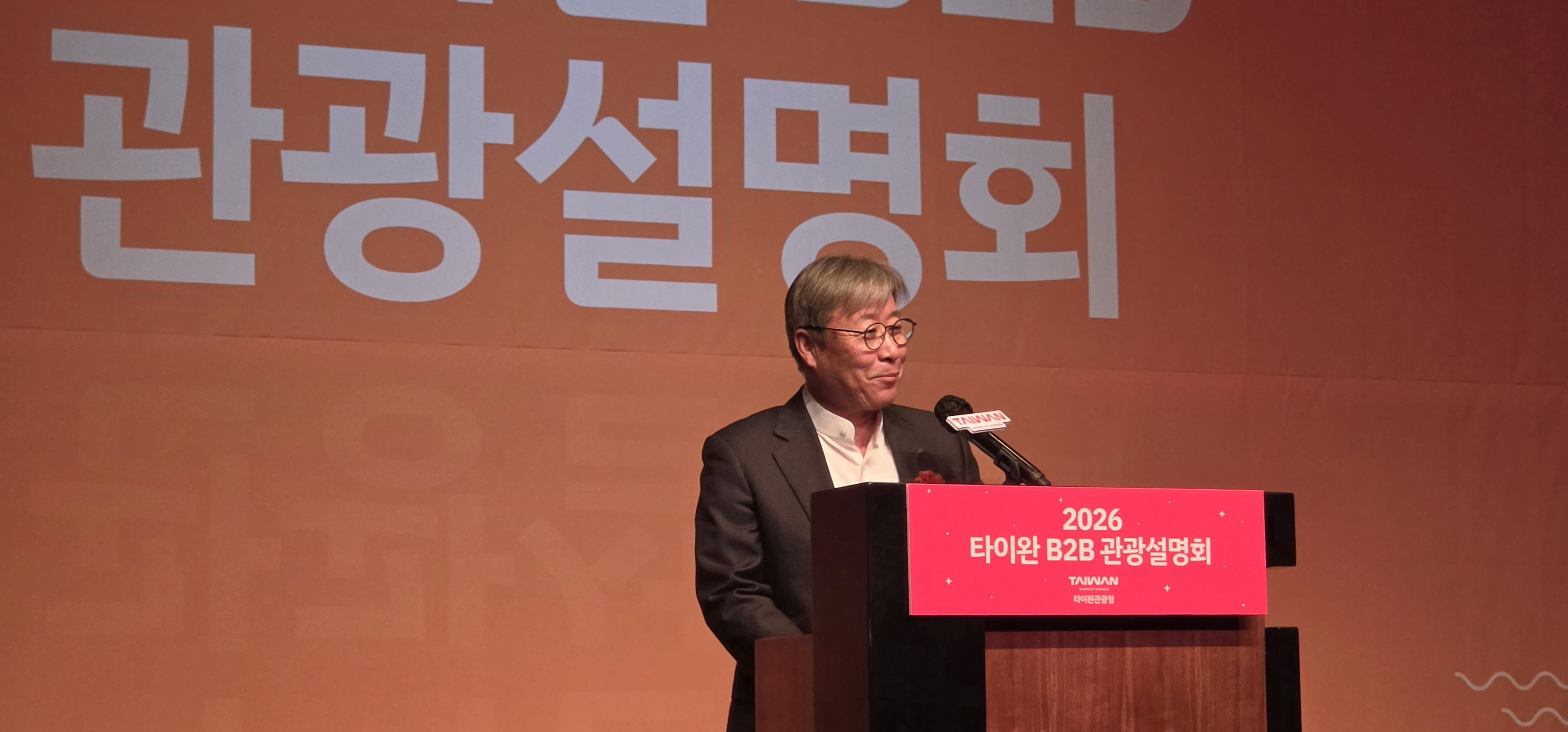 '2026 타이완 B2B 관광 설명회'에서 축사를 하고 있는
